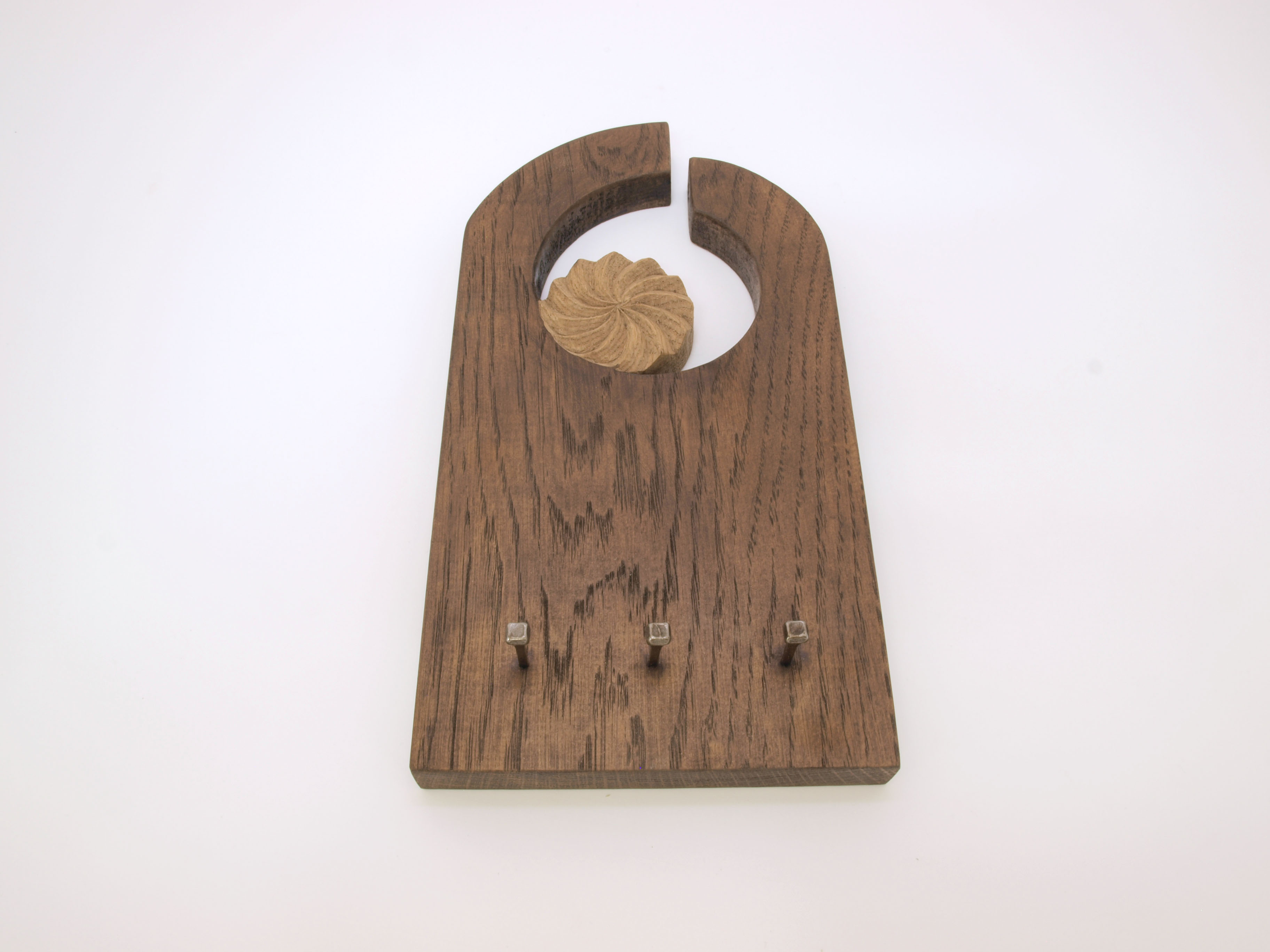 Cuelga llaves con estela tallado en madera de roble, tratado con betún judaico a dos tonos con cuatro colgadores de acero.